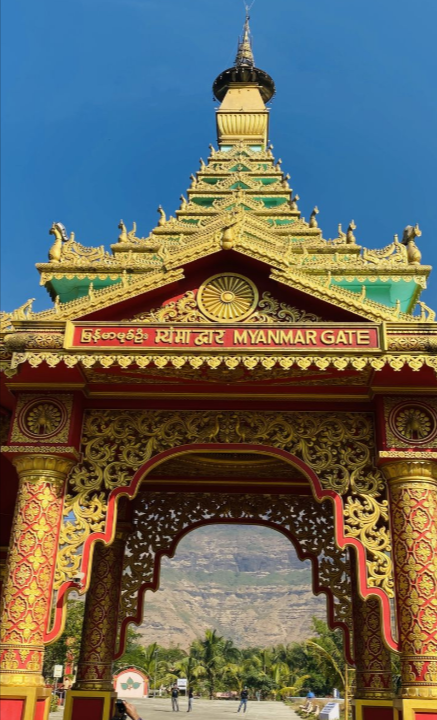 The Myanmar Gate is a grand entry to the Dhamma Giri Centre and symbolizes peace and spirituality. Its golden pillars and carved arches reflect traditional Burmese design.